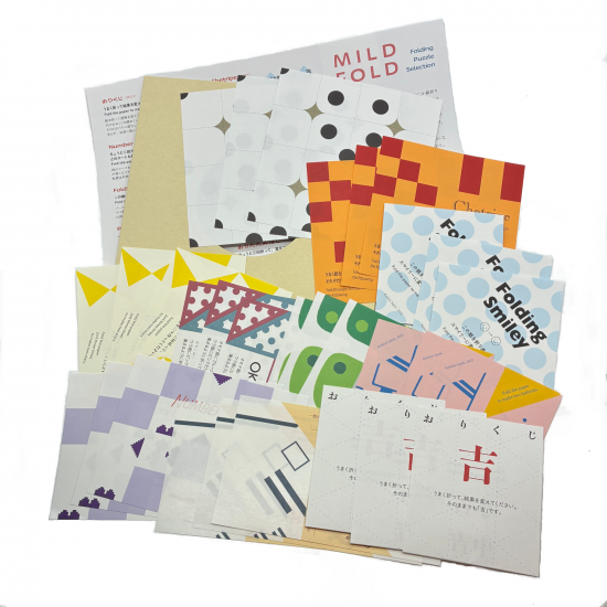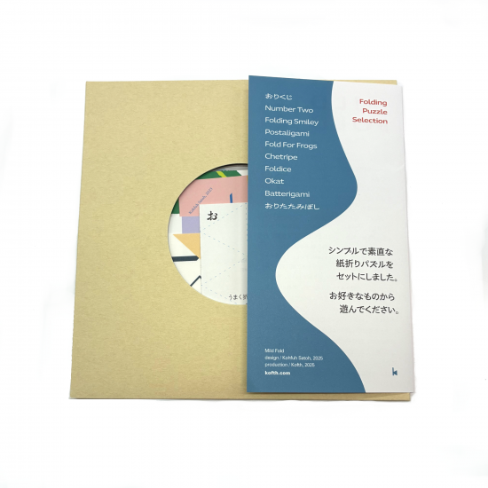 Folding Puzzle Selection MILD FOLD シンプルで素直な紙折りパズルをセットにしました。 お好きなものから遊んでください。 EPレコードのスリーブジャケットに紙折りパズルが全10作品。 作者によるライナーノーツ付き。 【パズルラインナップ】 ・おりくじ ・Number Two ・Folding Smiley ・Postaligami ・Fold For Frogs ・Chetripe ・Foldice ・Okat ・Batterigami ・おりたたみぼし ※各パズル3枚ずつ入っているので、みんなでたっぷり遊べます package size: 210*195*8mm design / Kohfuh Satoh, 2025 production / kofth, 2025 kofth.com